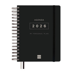 - Agenda de espiral - Día página - Cubierta de polipropileno opaco - Uñero microperforado - Goma elástica - Espiral simple