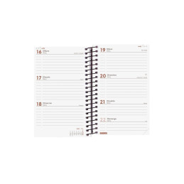 - Agenda de espiral - Semana vista - Cubierta de polipropileno opaco - Uñero microperforado - Goma elástica - Espiral simple