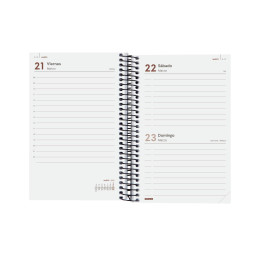 - Agenda de espiral - Semana vista - Cubierta de polipropileno - Uñero microperforado - Cierre de goma - Espiral simple