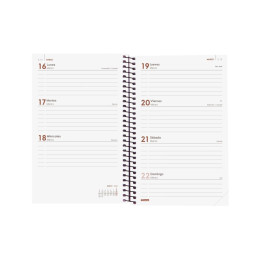 - Agenda de espiral - Semana vista - Cubierta de polipropileno - Uñero microperforado - Cierre de goma - Espiral simple