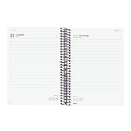 - Agenda de espiral - Semana vista - Cubierta de polipropileno - Uñero microperforado - Cierre de goma - Espiral simple