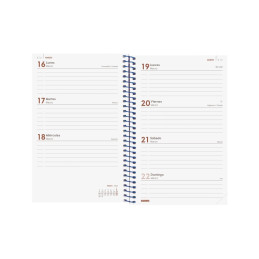 - Agenda de espiral - Semana vista - Cubierta de polipropileno opaco - Uñero microperforado - Goma elástica - Espiral simple