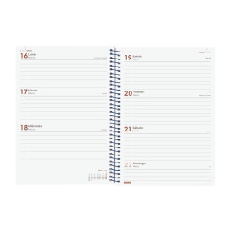 - Agenda de espiral - Semana vista - Cubierta extra dura de cartón - Uñero microperforado - Cierre de goma - Espiral doble - Incluye adhesivos, fundas y marcapáginas - Pestañas troqueladas
