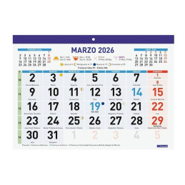 - Calendario encolado - Espacio para anotaciones - Números grandes - Agujero para colgar - Hojas microperforadas - Con mes anterior y posterior - Formato 43x31cm