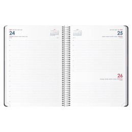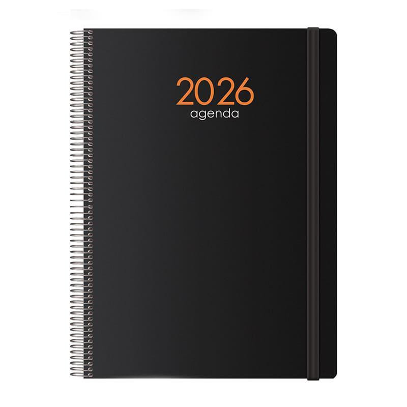 - Agenda de espiral - Día página - Cubierta de polipropileno - Uñero microperforado - Cierre de goma - Espiral simple