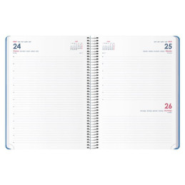 - Agenda de espiral - Semana vista - Cubierta de polipropileno - Uñero microperforado - Cierre de goma - Espiral simple