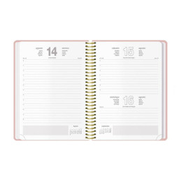 - Agenda de espiral - Semana vista - Cubierta de polipropileno opaco - Uñero microperforado - Goma elástica - Espiral simple