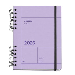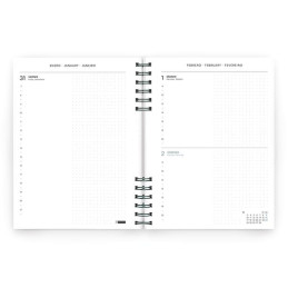 - Agenda de espiral - Semana vista - Cubierta de polipropileno opaco - Uñero microperforado - Goma elástica - Espiral simple