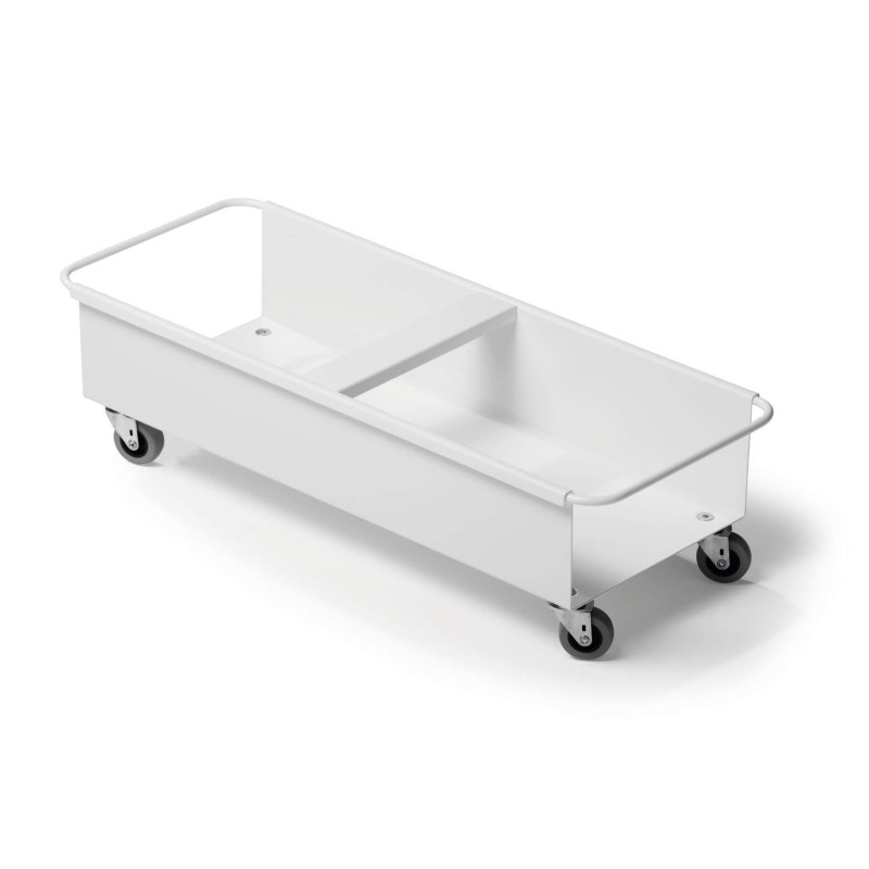 - Carro de metal esmaltado - Para contenedores rectangulares - Con cuatro ruedas giratorias - Dimensiones: 18x47x26cm.
