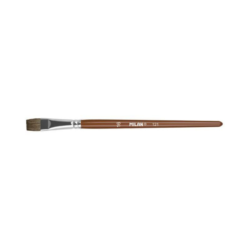 - Pincel plano con mango corto de madera - Barnizado en color marrón y virola de aluminio - Composición: 70% pelo natural de cabra + 30% sintético - Adecuado para acuarela y técnicas acuosas, témperas...