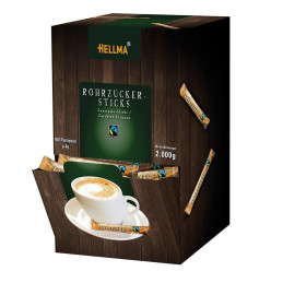 Sobres de azúcar de caña con la certificación Fairtrade. Paquete de 500 porciones de 4gr., envueltos individualmente en una caja dispensadora. Para endulzar las bebidas calientes.
