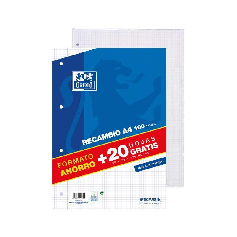 - Recambio 100 hojas - Formato A4 - 2 taladros - Rayado: 5x5 con margen